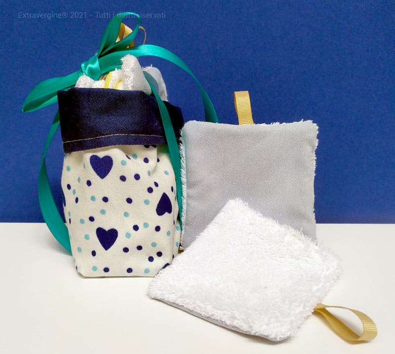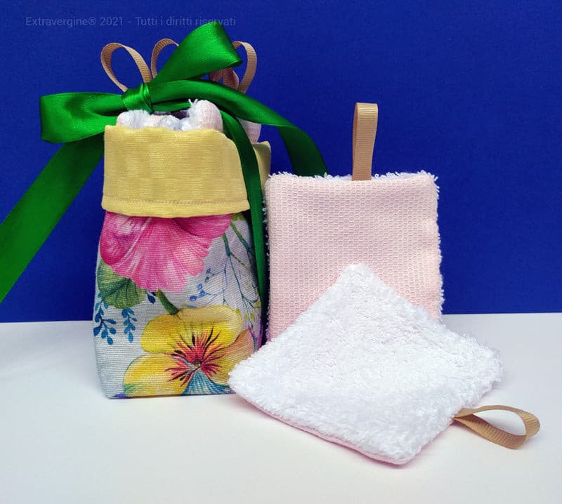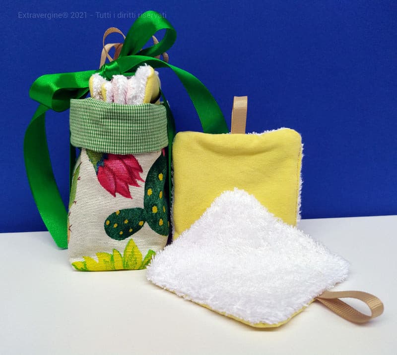 Realizzato interamente a mano, in modo artigianale, e con materiali ecologici, ecosostenibili, ad impatto e a km zero. Il set di pad in cotone e spugna è una valida alternativa alle spugnette sintetiche o ai dischetti di cotone usa e getta. E’ realizzata da un lato in morbida spugna di cotone e dall’altro in cotone pettinato, con un pratico appendino.